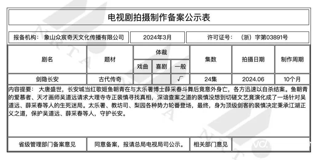 另外,象山众宸奇天文化传播有限公司备案的爱奇艺名堂《剑隐长安》虽无平直历史东谈主物探究,但从时间配景和东谈主物简介来看,两位主角吴谈远和裴慎应所以唐朝画家吴谈子和以剑舞并排唐代三绝的武官裴旻为原型改编。