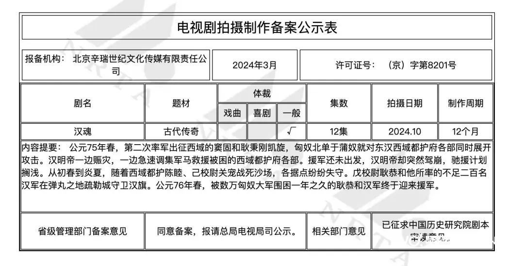 山西播送电视台备案的《粮安宇宙》诠释注解的是《农政全书》作者,中国明代农艺师、天文体家、数学家徐光启的故事;《子胥听说》的主角则是春秋战国时辰的谋略家、军事家伍子胥,备案方为杭州玄女影视文化传媒有限公司;细腻长歌(厦门)影业有限公司备案的《热血寒刀》中的主要邪派脚色为晚明阉东谈主魏忠贤;北京辛瑞世纪文化传媒有限包袱公司备案的《汉魂》故事简介中出现了窦固、耿秉等多位东汉武将的名字。